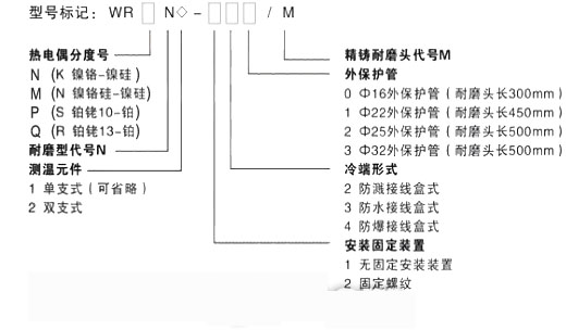 | 热电偶分度号 | 测温元件 | 外保护套管直径 | 使用温度 | 耐磨头长度 | 长度L/l | 过程连接 |